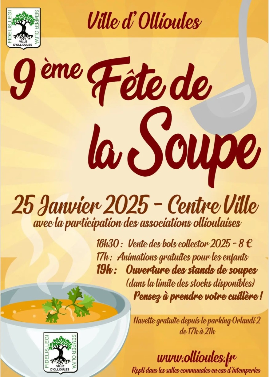 La Fête de la Soupe, événement culinaire phare d’Ollioules, fête sa 9ᵉ édition ! Dans une ambiance conviviale et chaleureuse, venez découvrir ou redécouvrir l’art de la soupe, un plat traditionnel remis au goût du jour par des passionnés. Associations locales et amateurs de gastronomie se réunissent pour vous offrir une soirée gourmande où créativité et partage sont à l’honneur !
