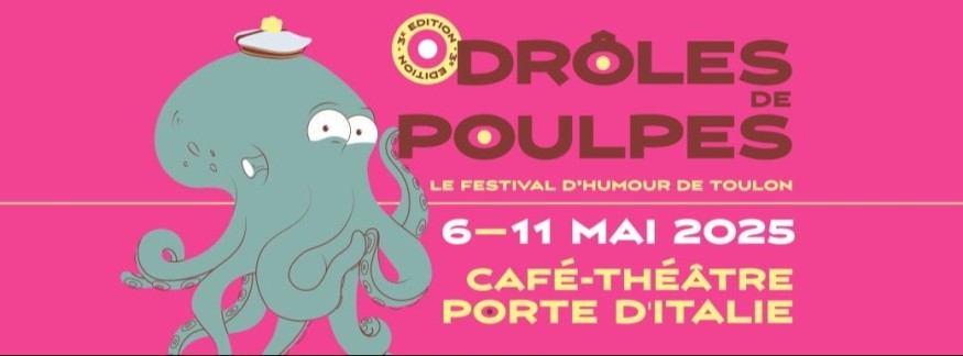 Prêts pour la troisième édition du festival Drôles de Poulpes ? Rendez-vous du 6 au 11 mai 2025 à Toulon avec un programme qui célèbre l'humour sous toutes ses formes, du one man / woman show à l'impro en passant par l'humour visuel, le stand up ou la chanson humoristique !