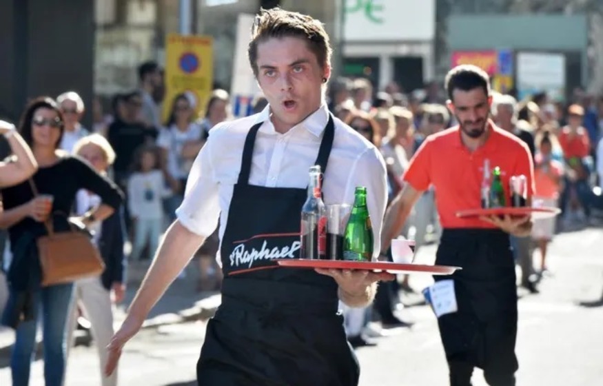 Trente-cinq garçons de café et serveuses parcourront 2,4 km avec la lourde tâche de ramener leur plateau garni à bon port.