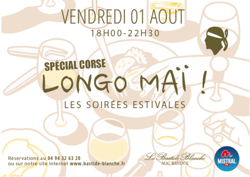 Vendredi 1er août, direction le Domaine de la Bastide Blanche pour la soirée Longo Maï ! Au programme : soirée estivale spéciale Corse avec animations musicales, dégustations de vins et foodtruck.