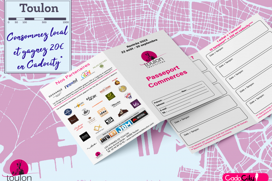 Jusqu'au 30 septembre prochain, les boutiques participantes vous remettront un livret papier aux couleurs des Vitrines de Toulon. À chaque achat de plus de 10€ dans une boutique partenaire, faites tamponner votre passeport et soyez récompensés de votre consommation locale en recevant 20€ en CadoCity® (chèques-cadeaux à dépenser dans les commerces de Toulon).
